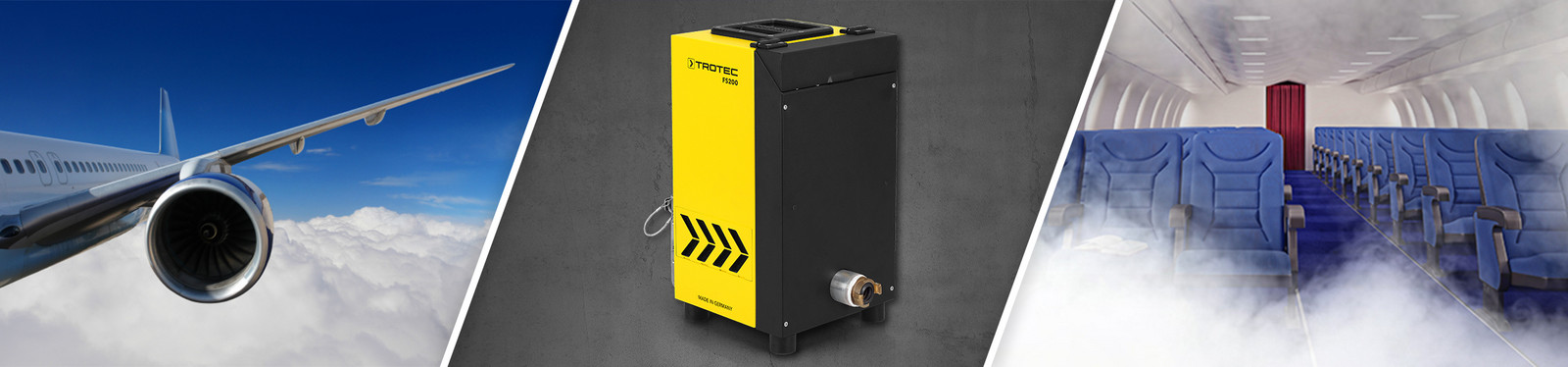 For at flypersonalet er forberedt på en sådan krævende indsats, kræver det, at de har trænet det under en evakueringsøvelse. Tåge- og røggassimulatoren FS200 fra Trotec er særdeles velegnet til den type brandøvelser. Det tager blot få minutter at anbringe det mobile apparatet i flyvemaskinen og slutte det til. Med sin stærke turbineydelse og den trinløst justerbare fluidpumpe fylder simulatoren maskinen med tyk røg på blot få minutter, og den ufarlige tåge simulerer situationer med ekstremt dårlig sigtbarhed. Det giver besætningen mulighed for at træne nødsituationer under realistiske forhold. For FS200 producerer konstant tyk, hvid røg - også over længere tid.